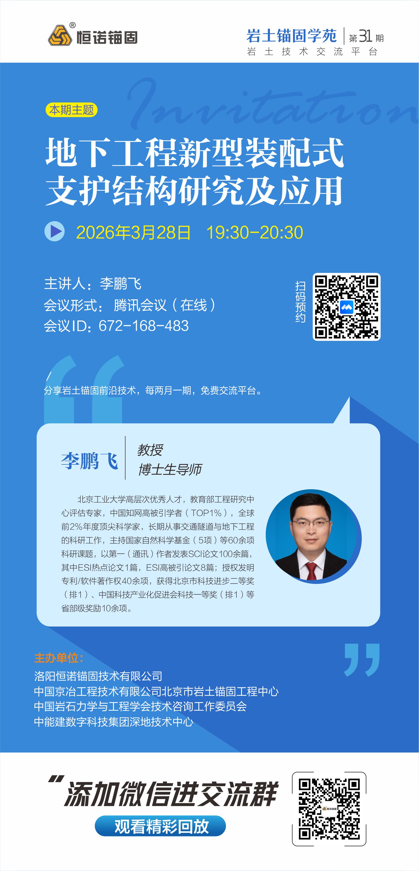 巖土錨固學苑將于2026年3月28日(周六)19:30-21:30舉辦第31期,本期主題:深部巖體讓壓吸能錨固支護理論與裝備研發(fā),歡迎廣大巖土錨固領域愛好者參與交流。