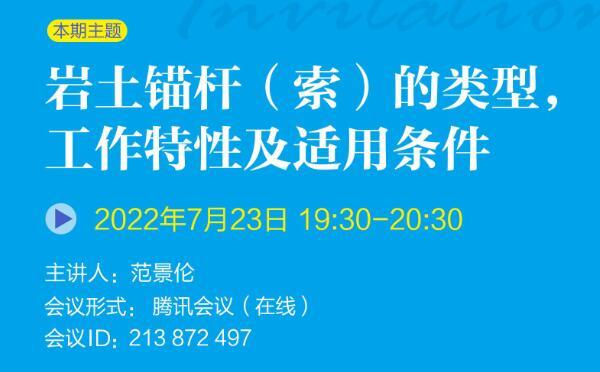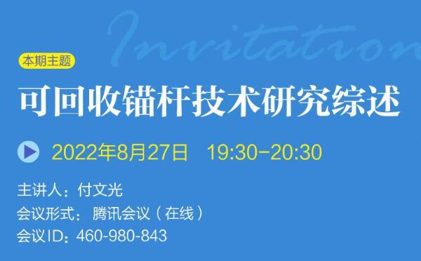 發(fā)布日期:2022-09-19 09:55巖土錨固學苑將于2022年8月27日(周六)19:30-20:30舉辦第期,本期主題:可回收錨桿技術研究綜述,歡迎廣大巖土錨固領域愛好者參與交流?! h形式:騰訊會議(在線......